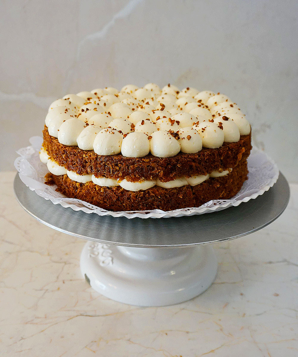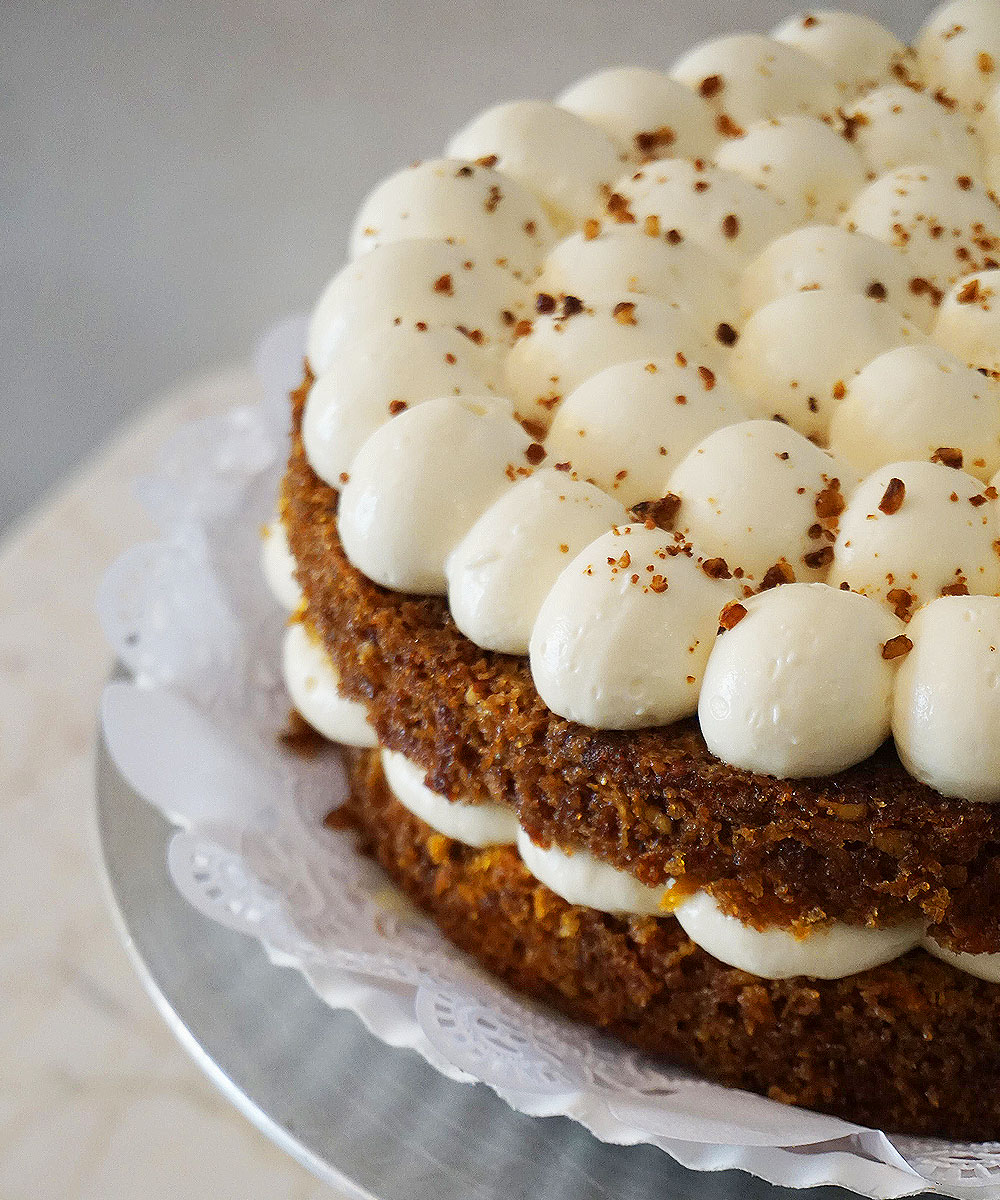 Con nuez, especias y betún de queso crema.